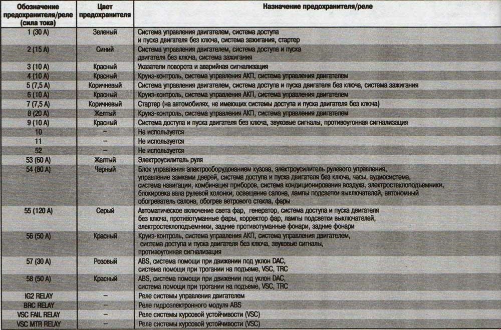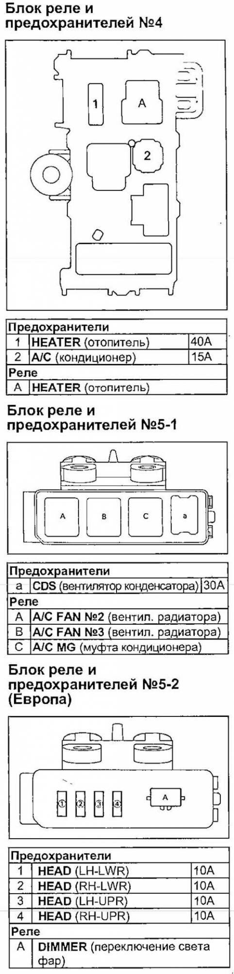 Тут приводятся обозначение и расшифровка блоков предохранителей для различных моделей автомобилей Toyota - Toyota Supra, Toyota Avensis, Toyota Corona Premio, Toyota Corolla, Toyota Auris, Toyota RAV4, Toyota Estima, Toyota Camry и некоторых других. Сами электрические схемы указанных авто вы можете посмотреть в другом разделе. Каждый из предохранителей защищает свою цепь и на панели предохранителя имеется обозначение защищаемой этим предохранителем цепи. Конечно никогда не заменяйте предохранители проволокой, даже в качестве временного устранения неисправности. Это может привести к серьёзным повреждениям проводки или даже к возгоранию. Мощность предохранителя указана на самом предохранителе. Если новый предохранитель сразу же перегорает, необходимо отыскать причину этого прежде, чем устанавливать новый предохранитель. Если у вас нет предохранителя с номинальным значением, то следует использовать предохранитель с более низким значением, как можно ближе к номинальному. Наиболее вероятной причиной перегорания предохранителя является короткое замыкание в цепи, вызванное порвавшимся или износившимся проводом. Вторая часть сборника.