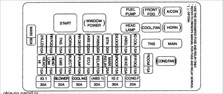 Всем известно, что электрооборудование любого автомобиля защищено от повреждения при электрической перегрузке с помощью предохранителей, это относится и к различным моделям KIA, представленным в данном сборнике схем блоков реле и предохранителей указанных авто. Автомобиль чаще всего имеет два блока предохранителей, один из них располагается в нижней части со стороны водителя, другой в моторном отсеке около аккумуляторной батареи. Кроме номинального тока приводится описание электрических цепей, защищаемых предохранителями. Полные схемы всех моделей КИА вы можете посмотреть в этом разделе.