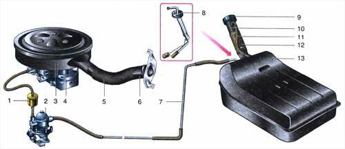 1 - фильтр тонкой очистки топлива; 2 - топливный насос; 3 - корпус воздушного фильтра; 4 - карбюратор; 5 - шланг подвода подогретого воздуха; 6 - воздухозаборник подогретого воздуха; 7 - топливопровод; 8 - топливоприемник; 9 - пробка топливного бака; 10 - наливная труба; 11 - вентиляционная трубка топливного бака; 12 - муфта наливной трубы; 13 - топливный бак.