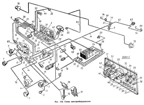Al — Блок предохранителей и реле, A3 — Прерыватель стеклоочистителя, А6 — Прерыватель указателя поборота, А7 — Магнитола, А8 — Реле блокировки демультипликатора, BAI, BA2— Громкоговоритель, ВК — Датчик температуры, ВР1.ВР2 — Датчик давления воздуха, ВРЗ — Датчик давления масла, ВР4.ВР5 — Датчик аварийного давления воздуха, BPI0 — Датчик аварийного давления масла, BV2 — Датчик спидометра, BV3 — Датчик скорости, ЕКЗ,ЕК4 -Свеча ЭФУ, Е1,Е2 — Фара головная, ЕЗ,Е4 — Фара противотуманная, Е5,Е6 — Передний фонарь, Е7 — Фонарь, Е8 — Фонарь номерного знака, Е9...Е11 — Фонарь знака автопоезда, EI2 — Фонарь подкузовной, Е13,Е14 — Боковой указатель поворотов, EI5.EI6 — Фонарь габаритный, Е17,Е18 — Задний фонарь, Е20 — Фонарь заднего хода, Е23.Е24 — Плафон освещения кабины, Е25 — Плафон освещения двигателя, Е26 — Фара — прожектор, Е28,Е27 — Плафон освещения спального места, ЕК1,ЕК2 — Фонарь освещения стеллажей, ЕЗО — Нагреватель зеркал, EL1...EL6 — Лампа подсветки приборов, FU1 — Предохранитель 60 А, FU2 — Предохранитель 30 А, FU3—FU9 — Предохранитель 8 А, FU11 — Предохранитель 16 А, G — Генератор, GBl, GB2 — Аккумуляторная батарея 6СТ I90A, НА 1 — Комплект электрических сигналов, НА2 — Сигнал пневматический, КК1 — Добавочное сопротивление, КК2 — Прерыватель контрольной лампы стояночного тормоза, К1 — Реле стартера, Ml — Стартер, М2, МЗ — Электродвигатель отопителя, М4 — Моторедуктор стеклоочистителя, М8 — Электродвигатель омывателя, РР — Комбинация приборов, Р2 — Тахометр, PS —Спидометр, RP — Реостат подсветки, XSl — Розетка основная, XS3 — Розетка, XS4 — Розетка переносной лампы в кабине, XS5, XS6 — Розетка, WA — Антена, SA1 — Выключатель стартера, SA2 — Переключатель стеклоочистителя, SA3 — Переключатель света главный, SA4 — Переключатель указателей поворота, SA5 — Переключатель отопителя, SA7 — Выключатель фонаря, SA8 — Выключатель плафона, SB1, SB3 — Выключатель кнопочный, SB4 — Выключатель аварийной сигнализации, SA9 — Выключатель клапана гидроотбора, Кнопочные выключатели с подсветкой: SB5 — Противотуманных фар, SB8 — Выключатель нейтрали, SB9 — Плафона освещения двигателя, SB11 — Фара—искателя, SB12 — Межколесного дифференциала, SB13 — Межосевого дифференциала, SB 14 — Фонарей автопоезда, SB 15 — Подогрева зеркал, SB20 — Освещения стеллажей, SK — Датчик аварийной температуры, SLI — Датчик уровня топлива, SP1.SP6 — Выключатель сигналов «стоп», SP7 — Выключатель, SQ1, SQ2 — Выключатель.
