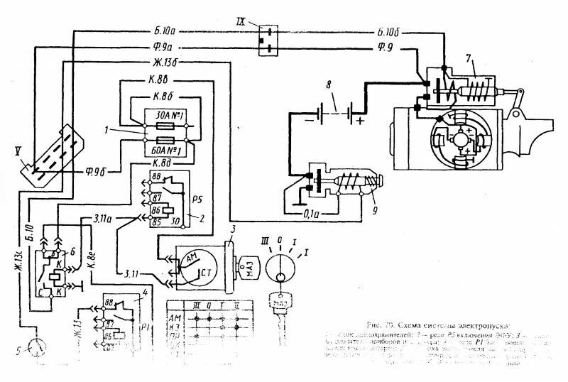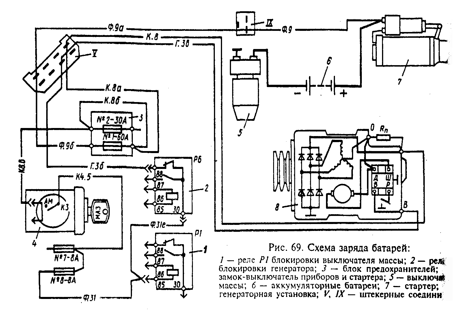 Типовая электросхема грузового автомобиля МАЗ 5551. Для увеличения схемы кликните по ней. На схемах буквами обозначены цвета проводов: Б - белый, Г - голубой Ж - желтый; О - оранжевый; Р - розовый; С - серый; 3 - зеленый; К - красный; Кч - коричневый; Ч - черный; Ф - фиолетовый. Система электроснабжения автомобиля состоит из двух источников: аккумуляторных батарей и генераторной установки переменного тока. Кроме того, в систему входит ряд промежуточных реле, выключатель массы батарей и замок-выключатель приборов и стартера.