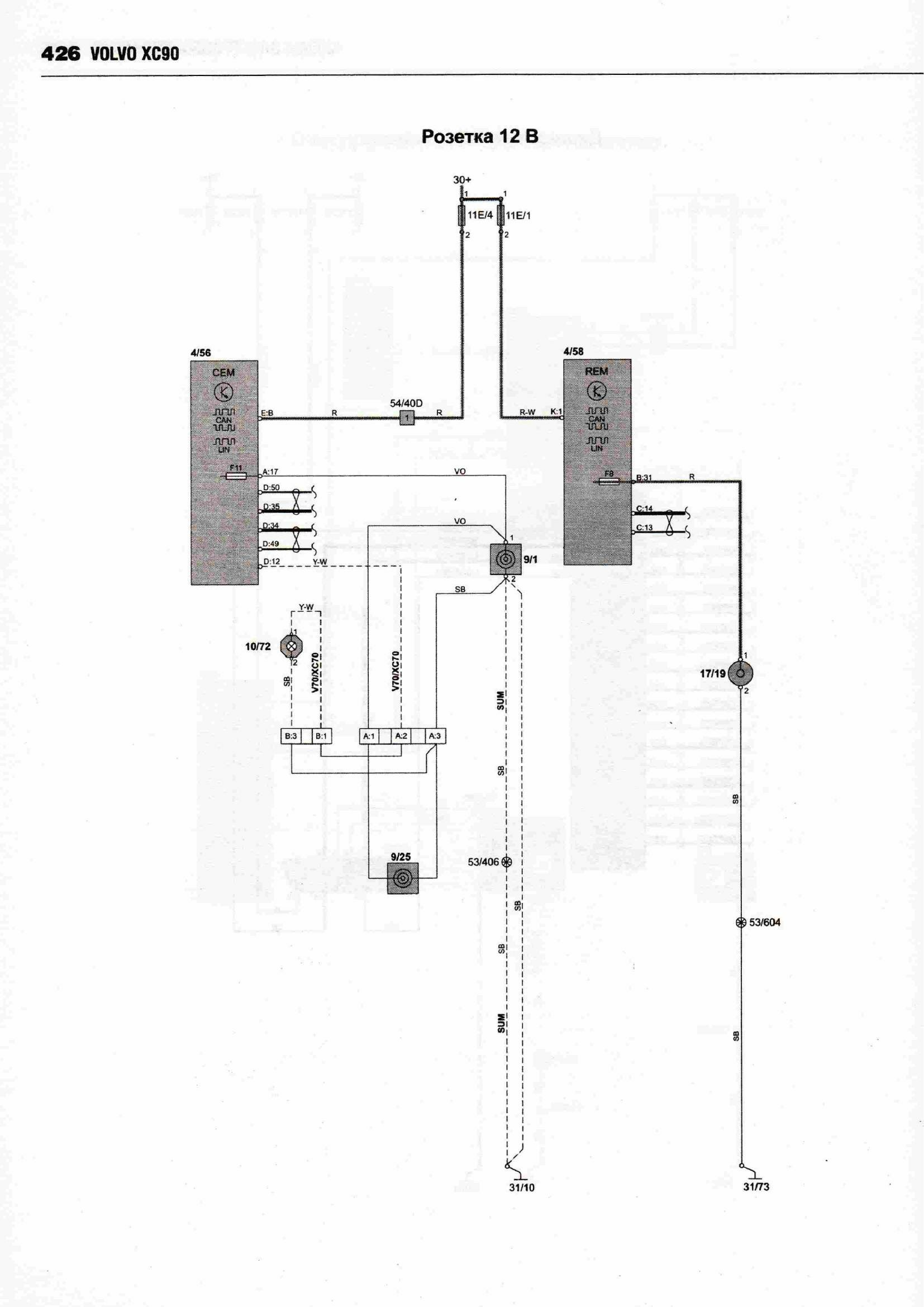 Принципиальные схемы электрооборудования автомобиля ВОЛЬВО ХС 90 с 2002 (двигатели типов бензин 2,5, 2,9, 3,2, 4,4 л и дизель 2,4). Начало сборника схем данного авто находится здесь. А тут вы можете посмотреть схемы фар и блока предохранителей. В Volvo 90 были разработаны активные биксеноновые фары, способные следовать направлению поворота автомобиля. Такие фары значительно повышают видимость в темное время. Процессор получает данные о различных параметрах движения автомобиля, проводит их анализ и настраивает систему для оптимального освещения дороги. Фары могут поворачиваться под углом до 15 градусов в каждом направлении, таким образом, общий диапазон поворота составляет 30 градусов. Это позволяет лучше и дальше освещать дорогу. Во избежание износа системы в дневное время функция поворота фар автоматически отключается. Ещё предлагается установка камеры для облегчения парковки. Это устройство, цель которого предотвратить наезд на людей при движении задним ходом и облегчить процесс парковки. Камера с большим углом охвата показывает зону сзади автомобиля. Причем система не только позволяет водителю видеть, что происходит сзади автомобиля, но она еще показывает планируемую траекторию движения задним ходом. Изображение выводится на экран навигационной системы, размещенный поверх панели приборов. Угол поля изображения охватывает всю зону за автомобилем, при этом обеспечивается минимальное искажение изображения. На экран выводятся вспомогательные линии, которыми обозначен периметр предполагаемой парковки после завершения требуемых маневров. Эти линии изменяются в зависимости от вращения рулевого колеса, помогая водителю сделать правильный выбор. Камера полностью интегрирована с системами авто.