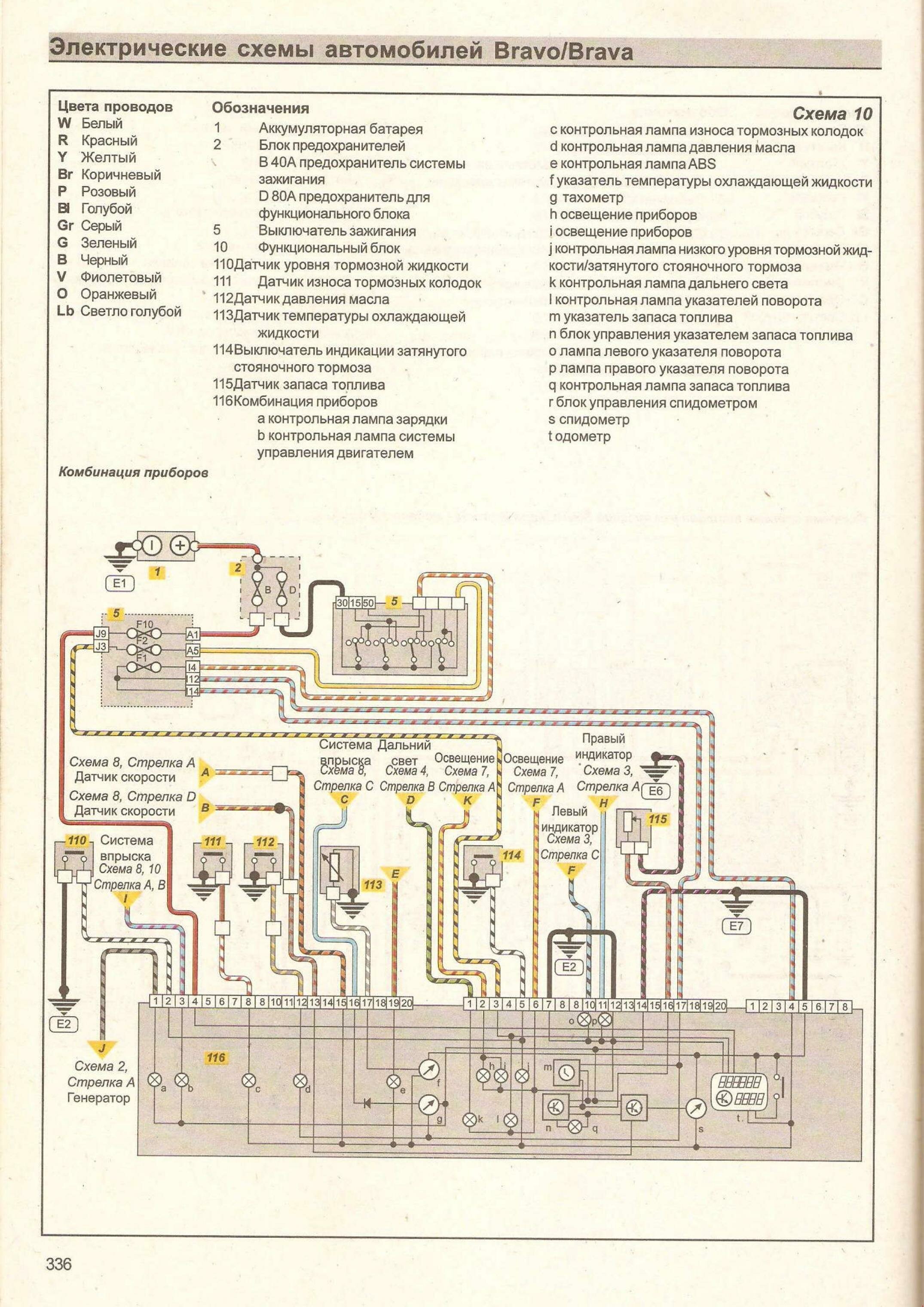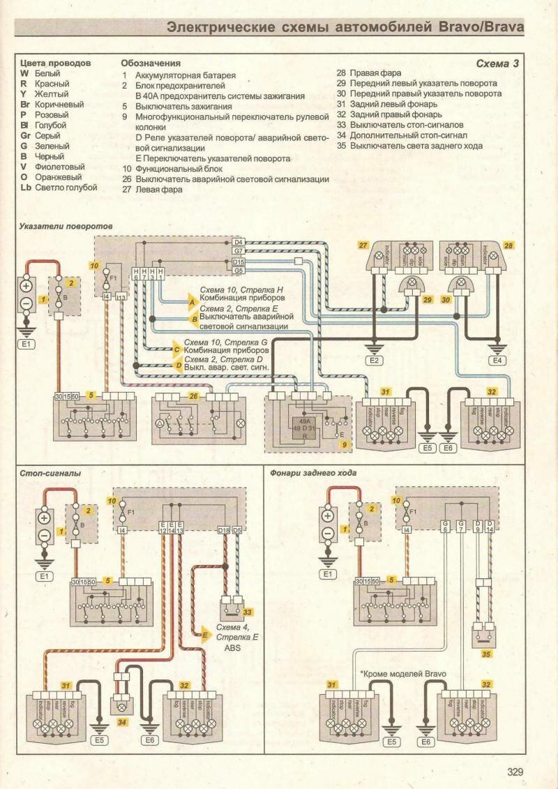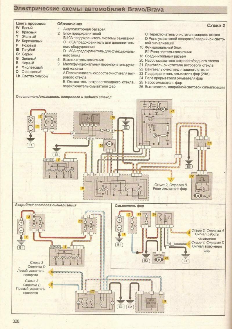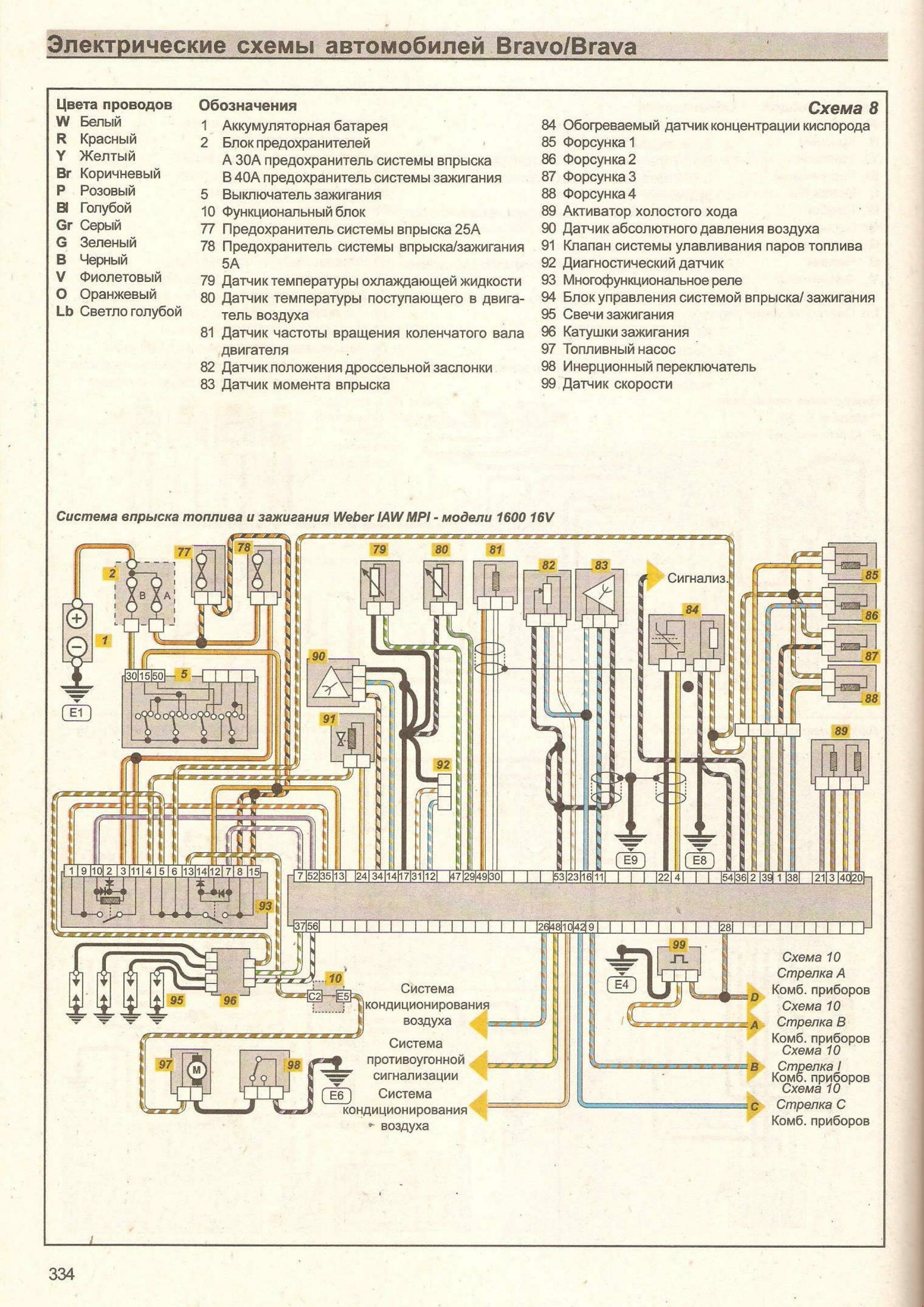 Принципиальные схемы электрооборудования на Фиат Брава 1995-2001 г.в. Пятидверный хэтчбек FIAT Brava выпускался с 1995 года по 2001 год. Родственником ФИАТ Брава является FIAT Bravо, у которого три двери. В 1995 году FIAT Brava получает громкое звание «Европейский Автомобиль Года». Предшественником ФИАТ Брава был автомобиль FIAT Tipo. На базе ФИАТ Брава в 1996 году увидел свет FIAT Marea, а в 1998 году на основе FIAT Brava был создан минивэн FIAT Multipla.