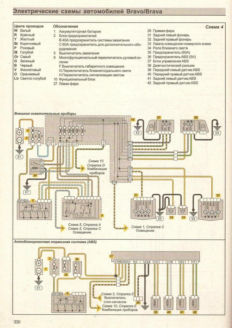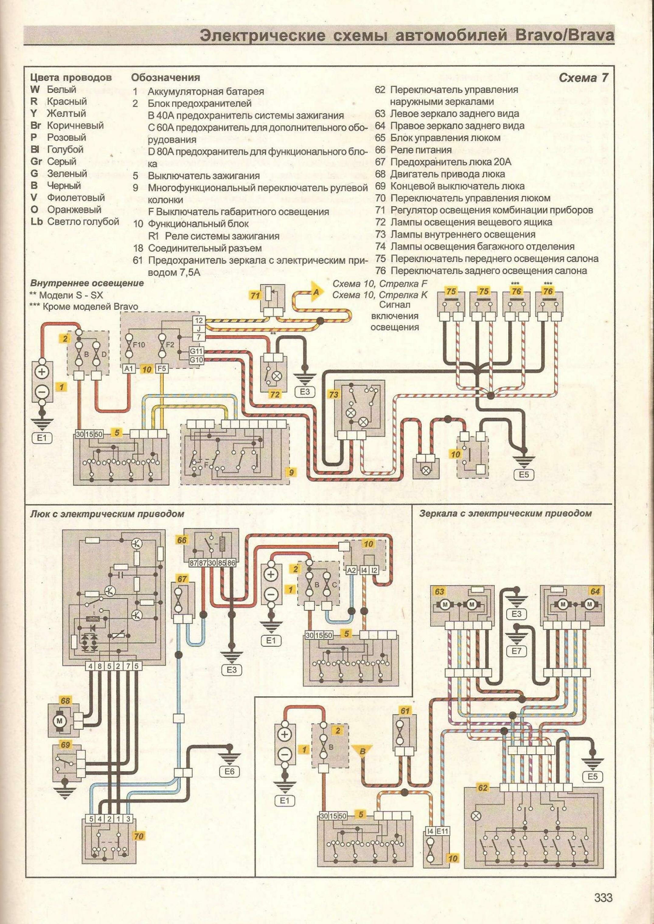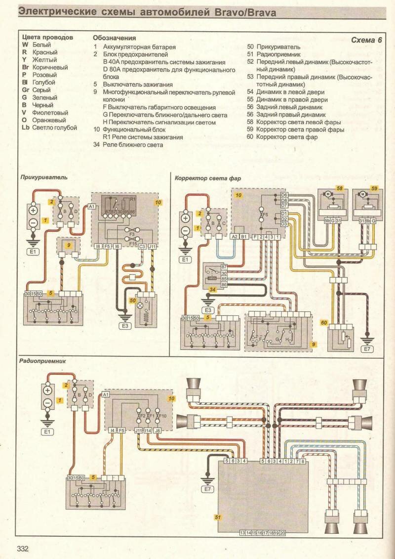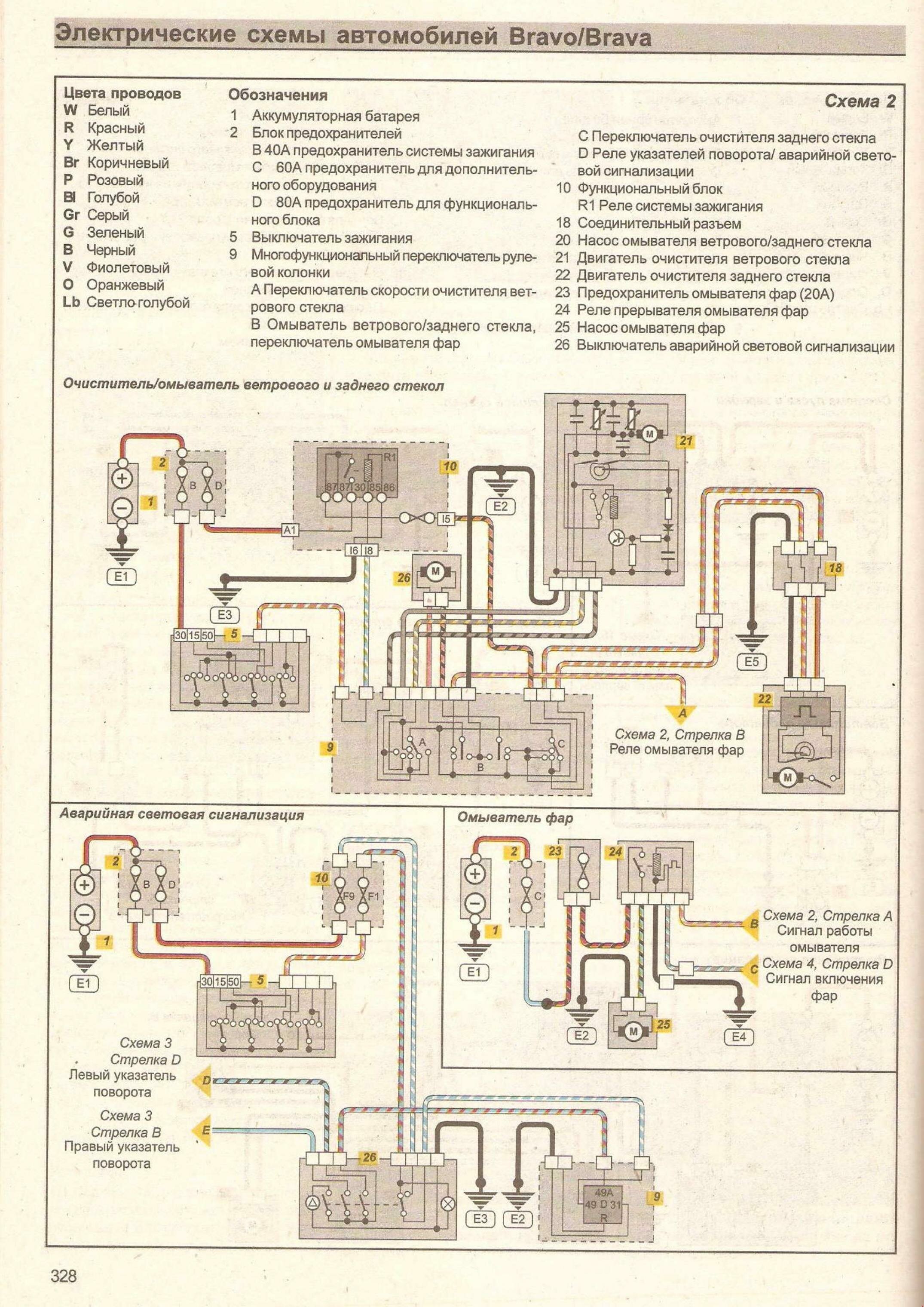 Принципиальные схемы электрооборудования на Фиат Брава 1995-2001 г.в. Пятидверный хэтчбек FIAT Brava выпускался с 1995 года по 2001 год. Родственником ФИАТ Брава является FIAT Bravо, у которого три двери. В 1995 году FIAT Brava получает громкое звание «Европейский Автомобиль Года». Предшественником ФИАТ Брава был автомобиль FIAT Tipo. На базе ФИАТ Брава в 1996 году увидел свет FIAT Marea, а в 1998 году на основе FIAT Brava был создан минивэн FIAT Multipla.