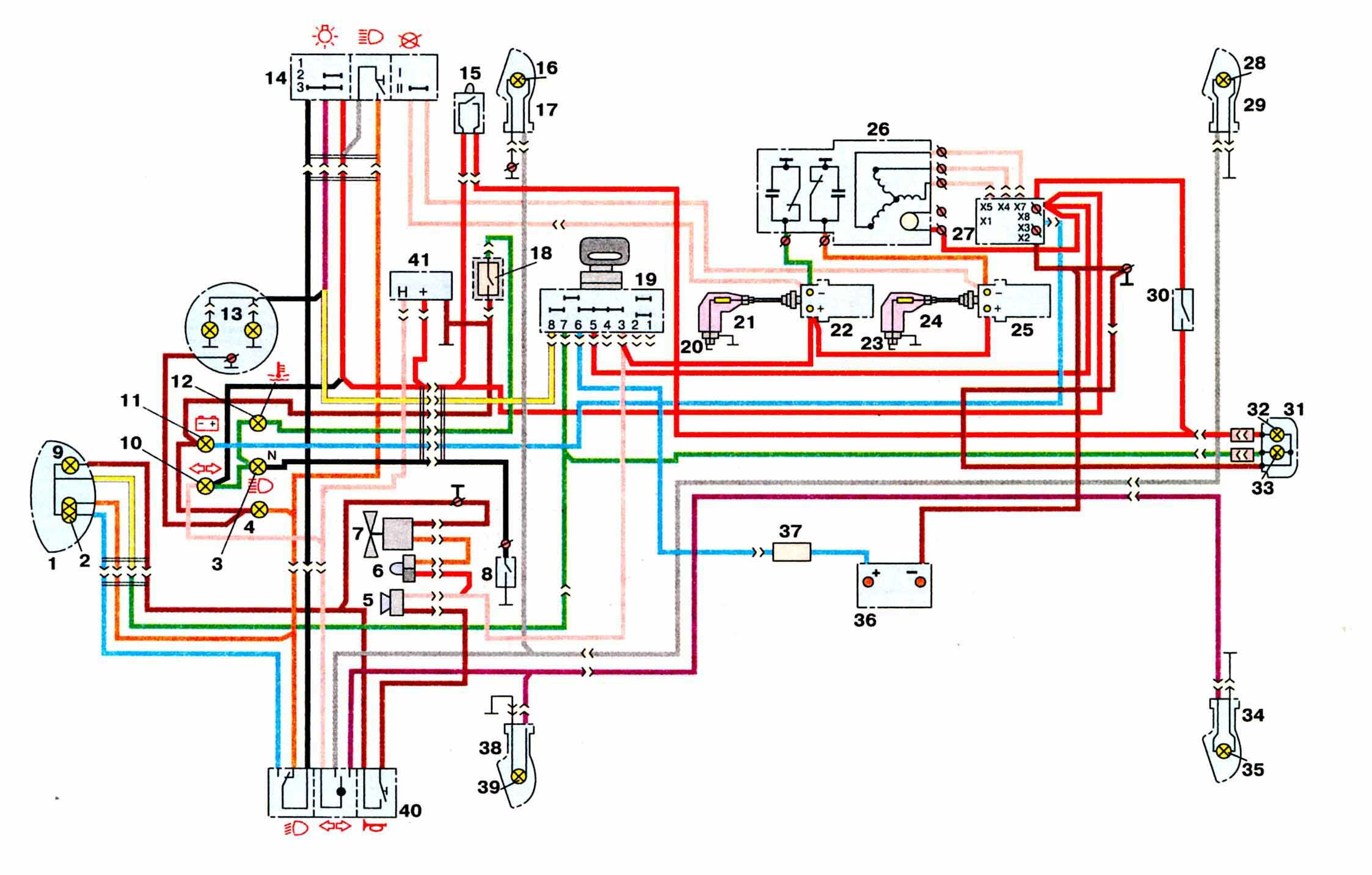 1 - фара ФГ 137Б2; 2 - лампа 12-45-40; 3, 4, 11, 12 - лампы А 12-1; 5 - звуковой сигнал С205Б; 6 - термореле включения электровентилятора 661.3710; 7 - электровентилятор; 8 - выключатель лампы "нейтраль"; 9 - лампа А 12-4; 10, 13 - лампа АМН 12-3-1; 14 - комбинированный переключатель (правый переключатель); 15 - выключатель ИЖВК 103; 16, 28, 32, 35, 39 - лампы А 12-21-3; 17, 29, 34, 38 - фонари -указатели поворота; 18 - датчик сигнализатора перегрева ТМ111; 19 - выключатель зажигания; 20, 23 - свечи зажигания; 21, 24 - свечные наконечники; 22, 25 - катушки зажигания; 26 - генератор ГП7; 27 - выпрямитель-регулятор напряжения БПВ14-10; 33 - лампа А 12-5; 30 - выключатель ИЖВК107; 31 - задний фонарь 111.3716; 36 - аккумуляторная батарея; 37 - предохранитель; 40 - переключатель сигнализации (левый переключатель); 41 - прерыватель указателей поворота.