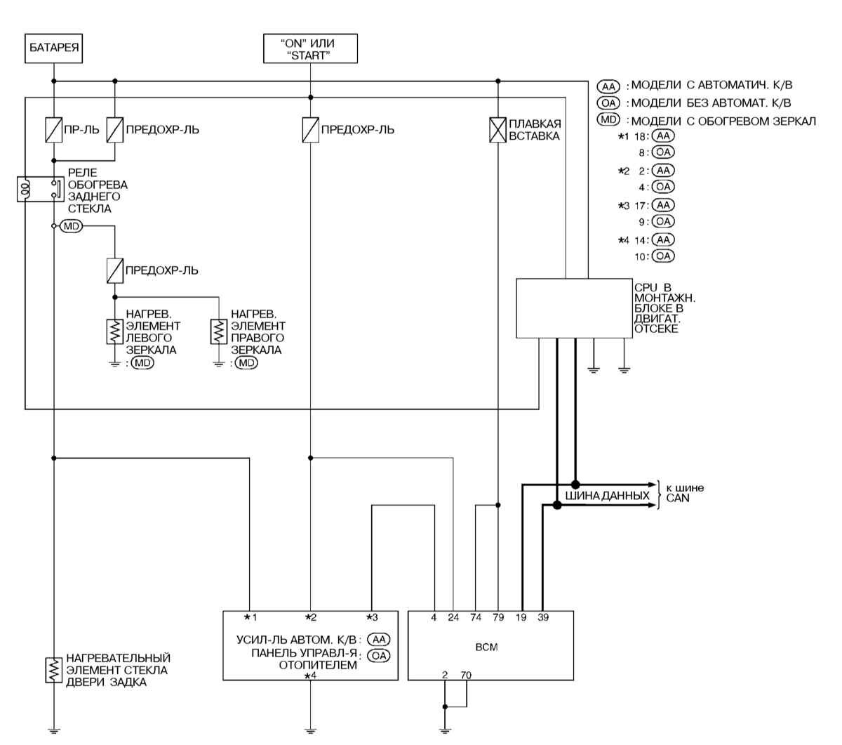 Электросхема обогрева заднего стекла и наружных зеркал