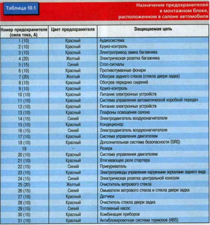 12. круиз контроль, поворотники и аварийка, датчик температуры жидкости АКП, питание блока TCM, спидометр, тахометр, указатели температуры, уровня масла и топлива, индикатор АКПП, звуковая сигнализация, обогрев стекла, дверные замки, противоугонная система, иммобилайзер, дистанционный ЦЗ, кондей, чек энджин и разъём OBD-2, подсветка, плафон салона, система контроля давления в шинах.
