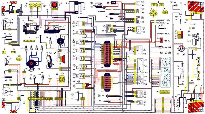1. Передние фонари.2. Боковые указатели поворота.3. Электродвигатель омывателя ветрового стекла. 4. Электродвигатель омывателя фар*. 5. Коммутатор. 6. Аккумуляторная батарея. 7. Стартер Нива. 8. Генератор. 9. Фары нива. 10. Моторедукторы очистителей фар*.11. Звуковой сигнал.12. Свечи зажигания.13. Концевой выключатель карбюратора. 14. Электромагнитный клапан карбюратора.15. Катушка зажигания.16. Моторедуктор очистителя ветрового стекла. 17. Блок управления электромагнитным клапаном карбюратора.18. Датчик-распределитель зажигания.19. Датчик указателя температуры охлаждающей жидкости.20. Датчик указателя недостаточного давления масла.21. Штепсельная розетка переносной лампы. 22. Датчик сигнализатора недостаточного уровня тормозной жидкости. 23. Реле-прерыватель очистителя ветрового стекла.24. Реле включения ламп заднего противотуманного света. 25. Реле включения элемента обогрева заднего стекла. 26. Реле включения очистителей и омывателя фар*.27. Реле включения ближнего света фар. 28. Реле включения дальнего света фар.30. Реле включения стартера.31. Реле-прерыватель аварийной сигнализации и указателей поворота. 32. Электродвигатель отопителя.33. Добавочный резистор электродвигателя отопителя. 34. Лампы подсветки рычагов управления отопителем.35. Выключатель ламп наружного освещения.36. Основной блок предохранителей. 37. Дополнительный блок предохранителей.38. Выключатель фонаря заднего хода.39. Выключатель стоп-сигнала. 40. Регулятор ламп освещения приборов.41. Выключатель зажигания.42. Трехрычажный переключатель. 43. Выключатель аварийной сигнализации.44. Выключатель очистителей и омывателей фар.45. Переключатель электродвигателя отопителя.46. Выключатель элемента обогрева заднего стекла.47. Выключатель ламп заднего противотуманного света. 48. Выключатели плафонов, расположенные в стойках дверей.49. Плафоны освещения салона. 50. Прикуриватель. 51. Выключатель лампы сигнализатора прикрытия воздушной заслонки карбюратора.52. Лампа сигнализатора прикрытия воздушной заслонки карбюратора.53. Выключатель лампы сигнализатора включения блокировки дифференциала. 54. Выключатель лампы сигнализатора включения стояночного тормоза.55. Датчик указателя уровня и резерва топлива. 56. Комбинация приборов. 57. Электродвигатель омывателя заднего стекла. 58. Задние фонари. 59. Колодка для подключения дополнительных стоп-сигналов.60. Колодки для подключения боковых указателей габарита.61. Колодки для подключения к элементу обогрева заднего стекла. 62. Фонари освещения номерного знака. 63. Моторедуктор очистителя заднего стекла.