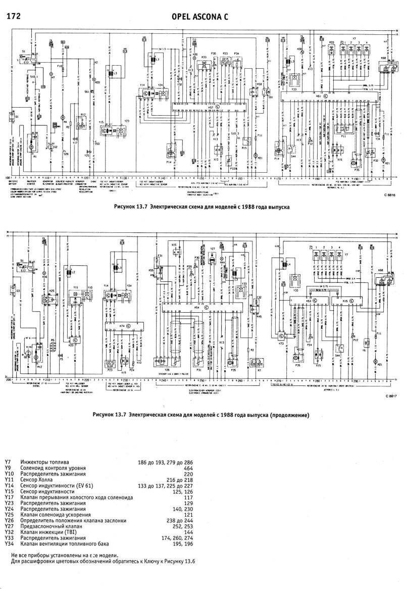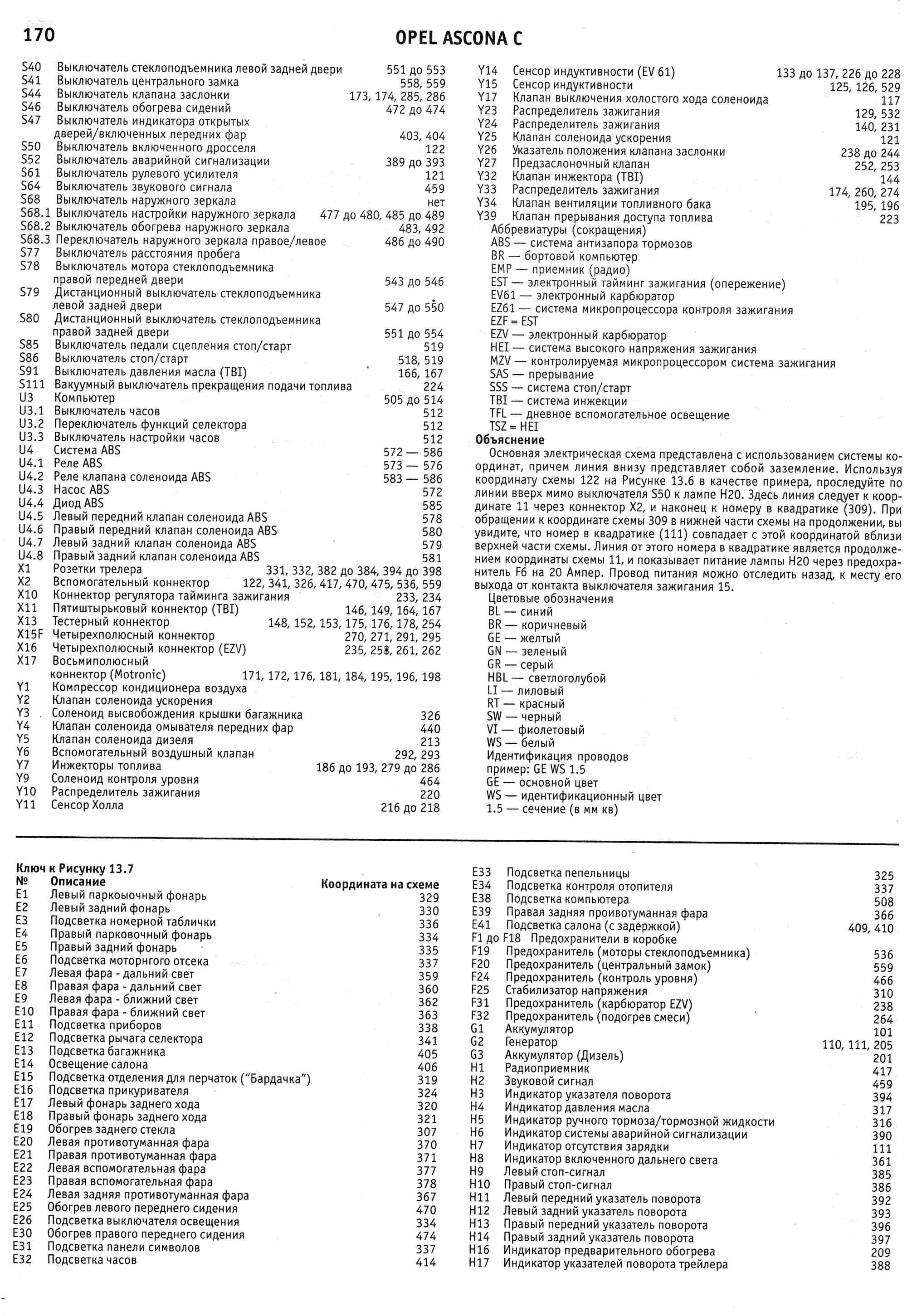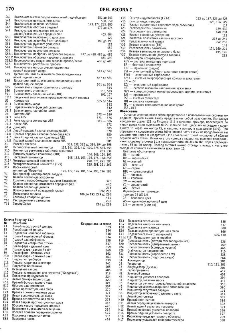 Электросхемы автомобиля Опель Аскона модельного ряда 1983-1988 годов, а именно: Opel Ascona 1984, Opel Ascona 1985, Opel Ascona 1986, Opel Ascona 1987, Opel Ascona 1988. На отдельных картинках приводятся расшифровки и обозначения элементов на схемах. Наименование элементов приведены в соответствии с DIN 40719, обозначение линий в соответствии с DIN 47002. Некоторое наложение участков схем Opel Ascona C облегчает чтение. Предназначено для специализированных автомастерских.