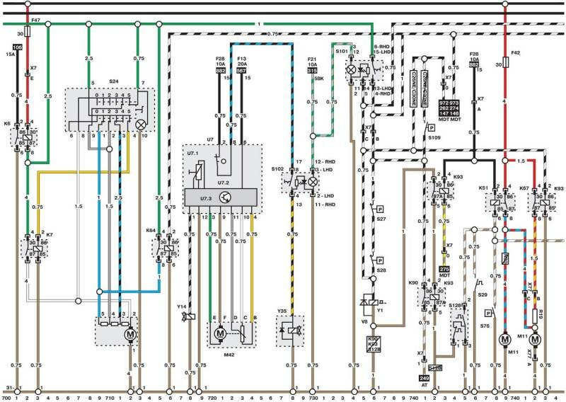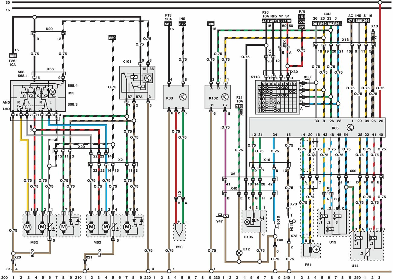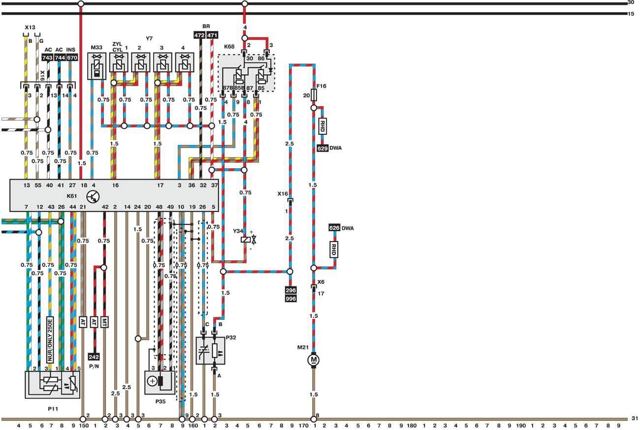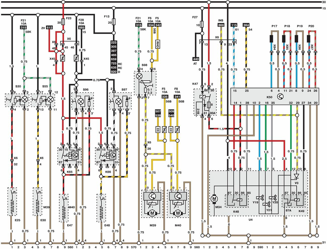 Электросхемы автомобиля Opel Omega (1993-1999). Все схемы в отличном качестве и с подробным описанием компонентов. Чтоб бесплатно скачать необходимую часть схемы - кликните на картинку и сохраните на компьютере. Представленны модули для модели Opel Omega B. Нижняя линия схемы обозначает массу или отрицательное соединение; цифры под этой линией являются номерами дорожек, что позволяет отыскать цепи и элементы при помощи ключа. Линия сверху схемы обозначает положительное соединение. Линия, помеченная номером 30, всегда под напряжением. Линия, помеченная номером 15, находится под напряжением только при включении зажигания.