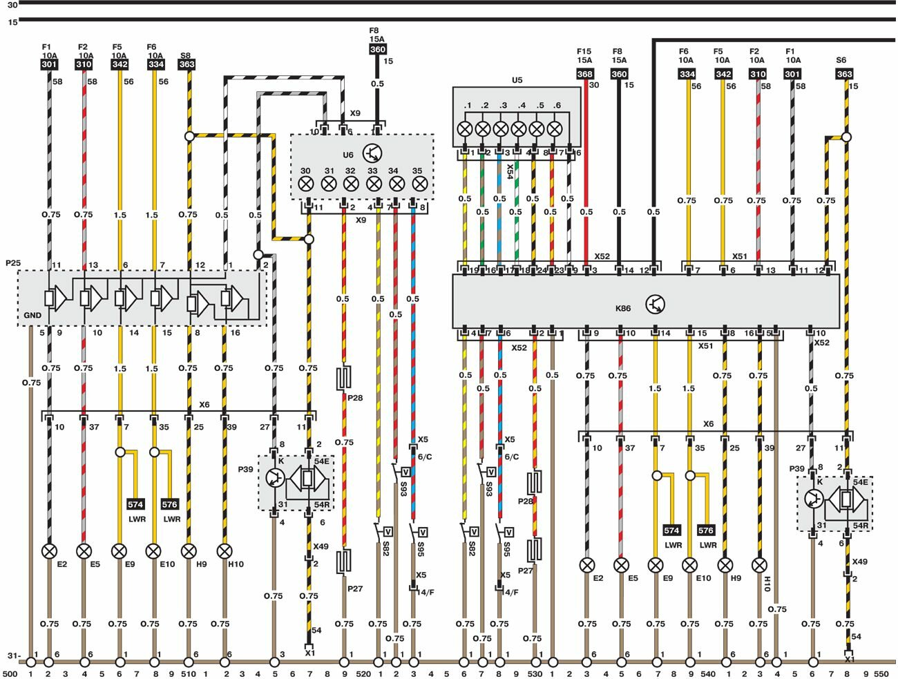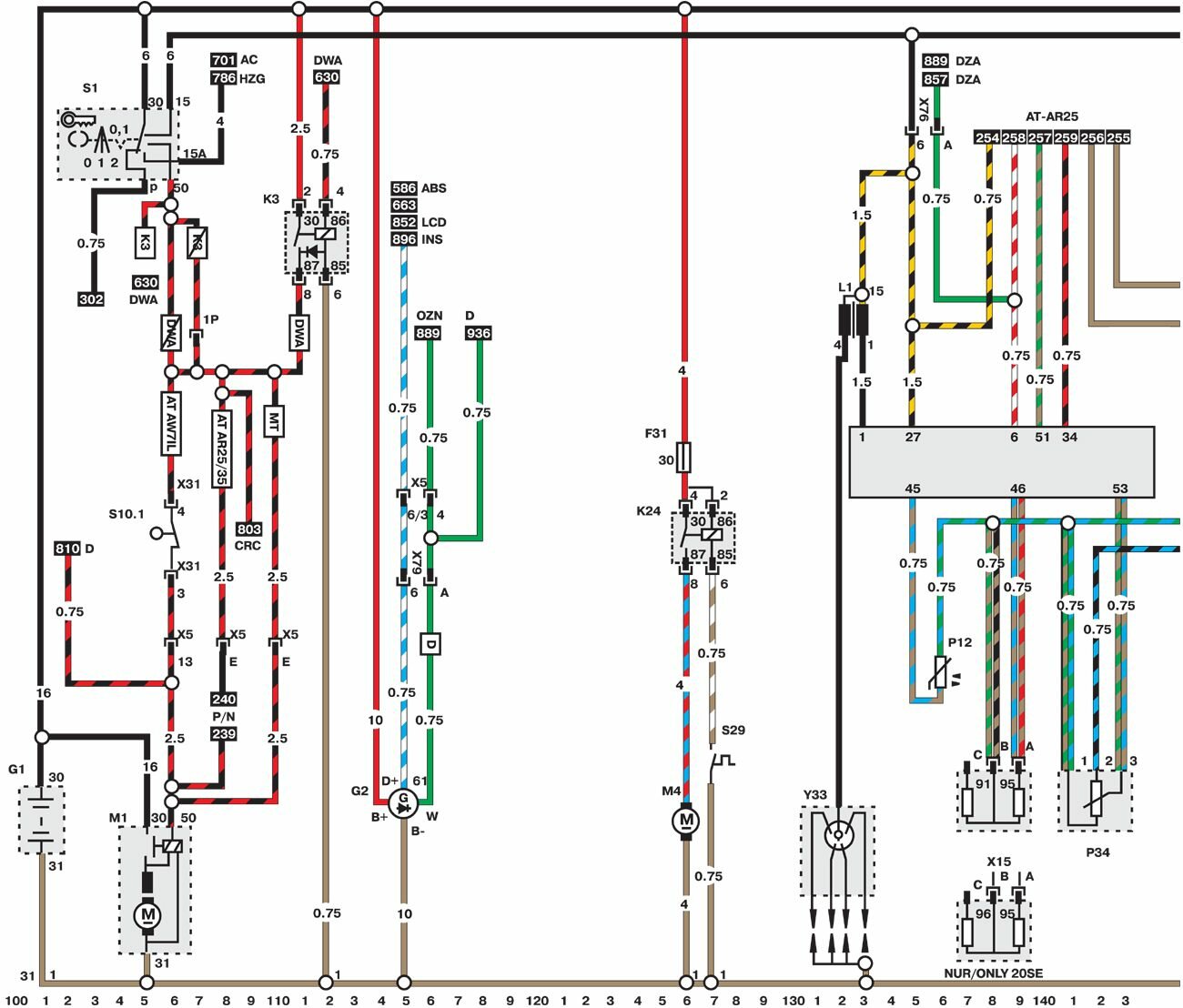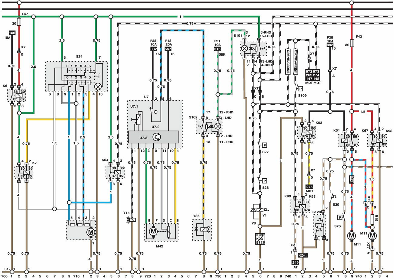 Электросхемы автомобиля Opel Omega (1993-1999). Все схемы в отличном качестве и с подробным описанием компонентов. Чтоб бесплатно скачать необходимую часть схемы - кликните на картинку и сохраните на компьютере. Представленны модули для модели Opel Omega B. Нижняя линия схемы обозначает массу или отрицательное соединение; цифры под этой линией являются номерами дорожек, что позволяет отыскать цепи и элементы при помощи ключа. Линия сверху схемы обозначает положительное соединение. Линия, помеченная номером 30, всегда под напряжением. Линия, помеченная номером 15, находится под напряжением только при включении зажигания.