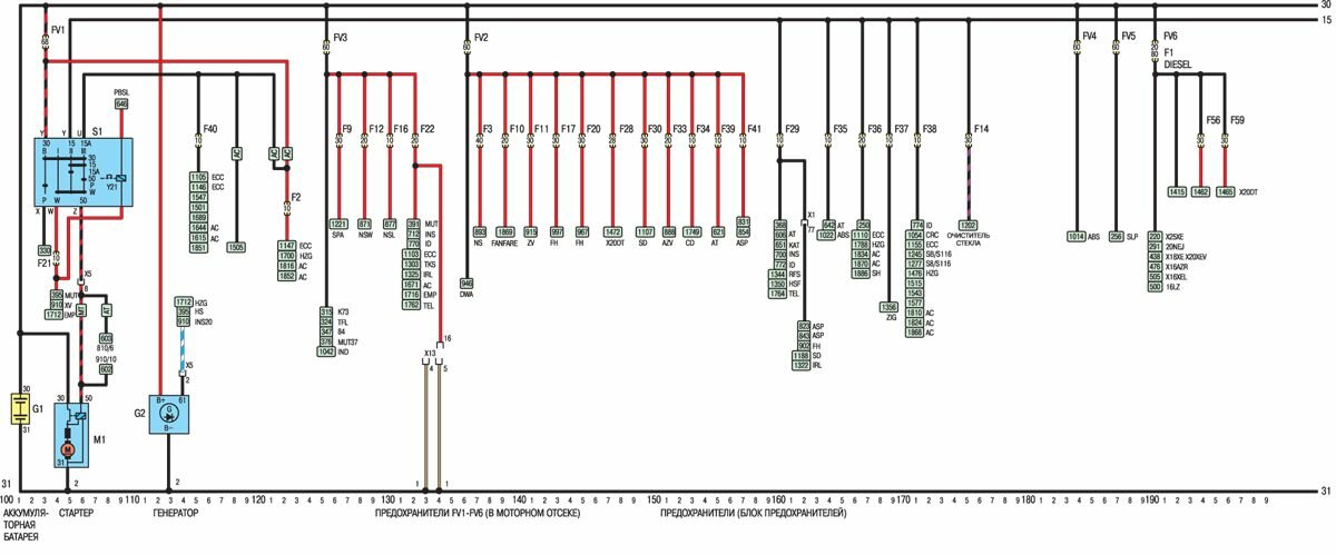 Электрическое оборудование автомобиля опель вектра. К плюсовым источником питания соединяются проводом, а с минусовым - через корпус, массу. Такой метод позволяет уменьшить число проводов и упростить монтаж. На автомобилях устанавливаются малообслуживаемые или необслуживаемые аккумуляторы. Электрическая система имеет 12-тивольтовое питание с отрицательным заземлением и состоит из аккумулятора, генератор, стартера, потребителей электроэнергии и электрических цепей.