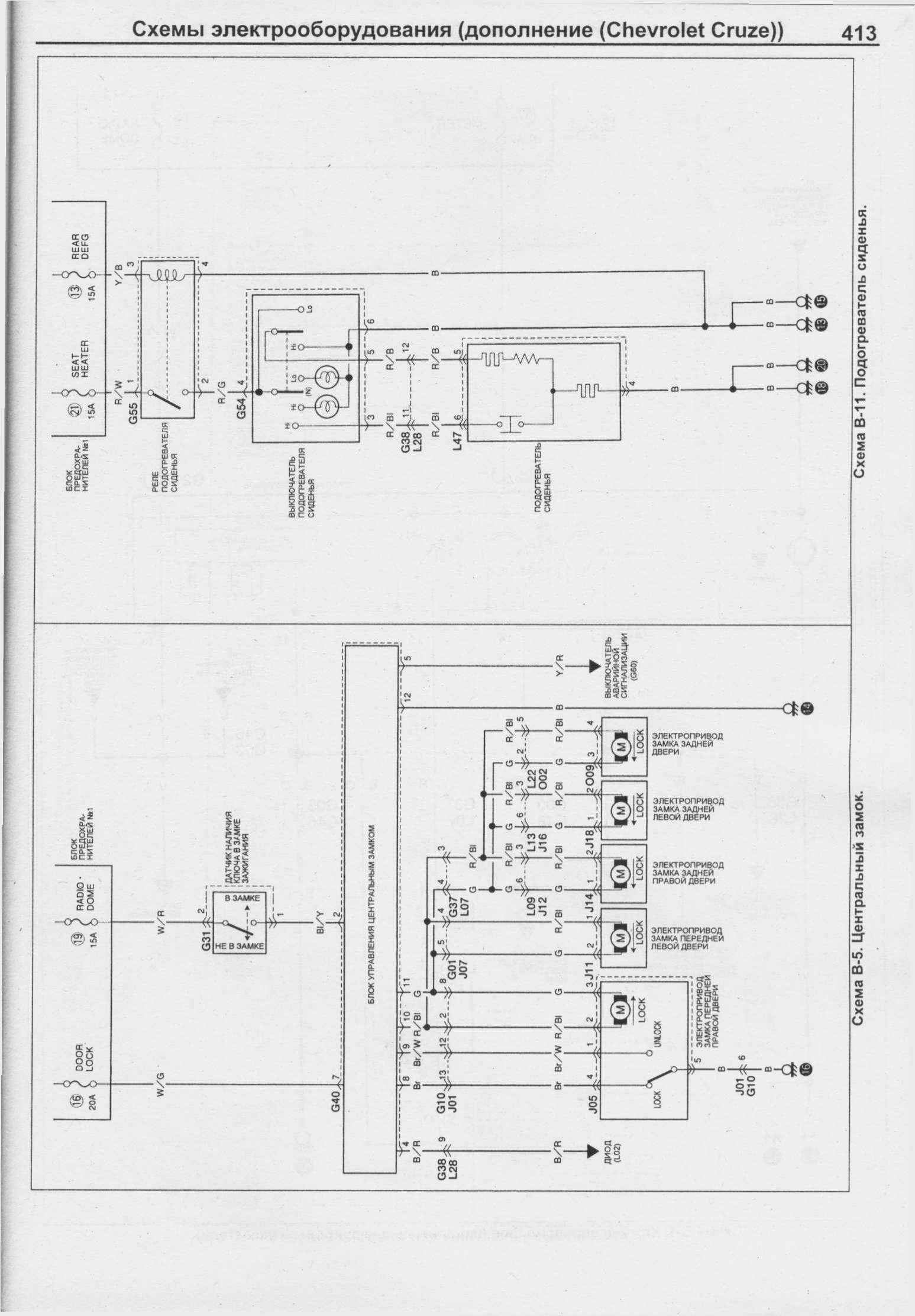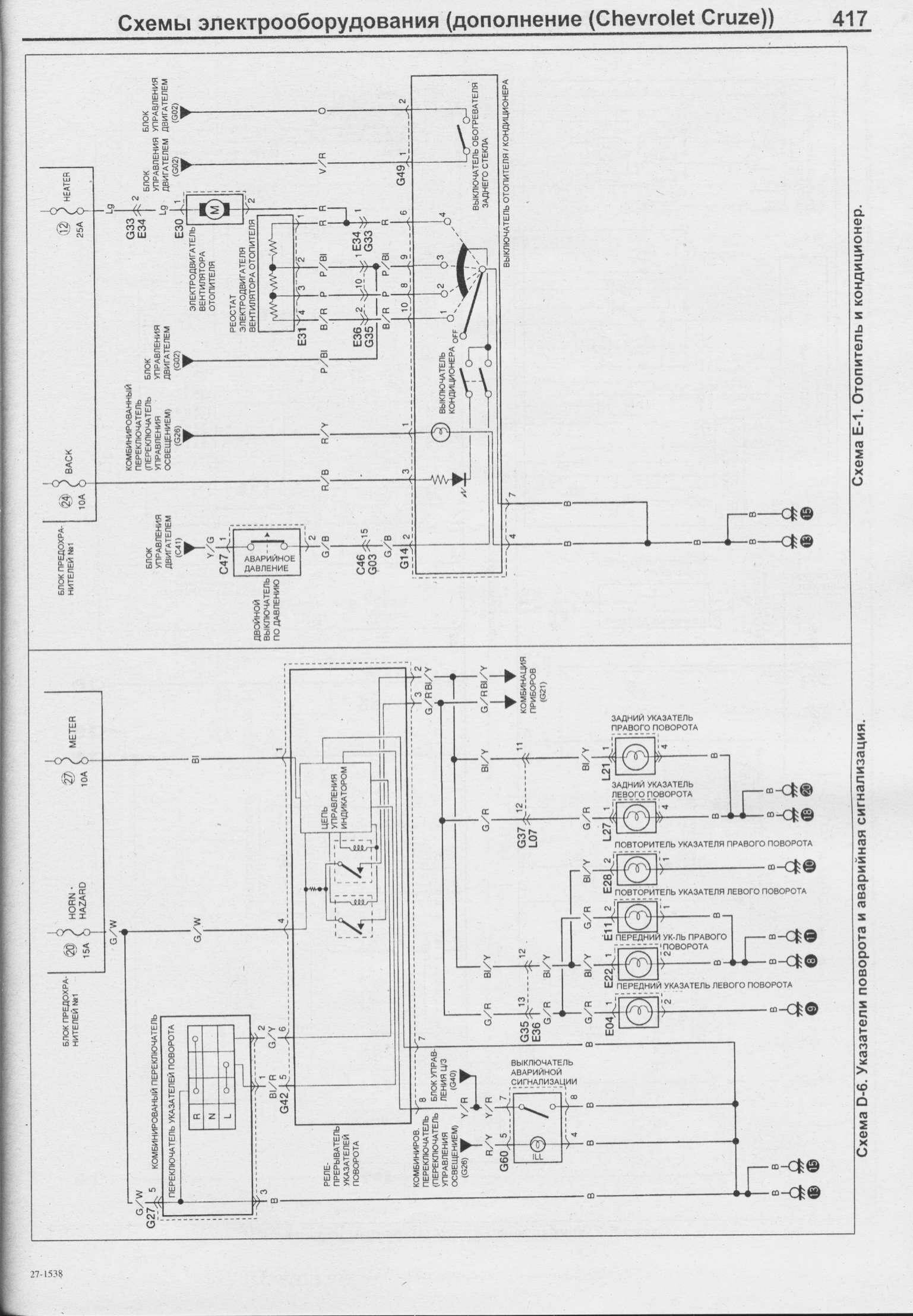 Электросхема отопителя, кондиционера, указателя поворотов и сигнализации Шевроле Круз