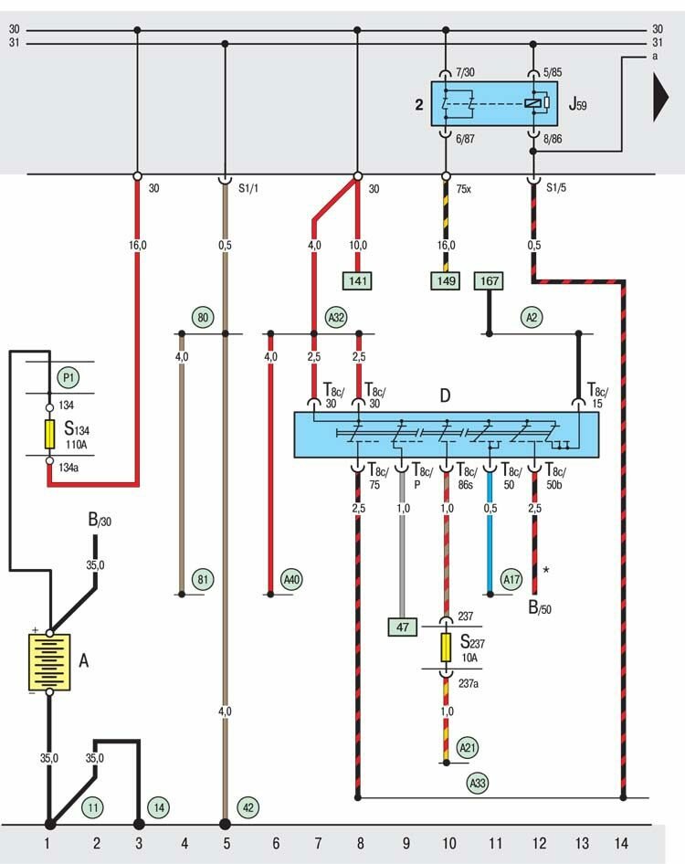Р1 – соединение с положительным полюсом (30) в коробке предохранителей на аккумуляторной батареее.