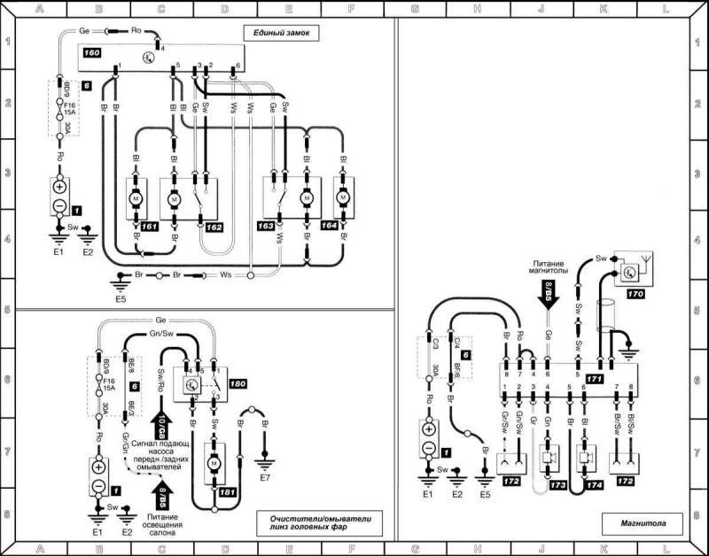 Автомагнитола, единый замок и очистители и омыватели линз головных фар - схема
