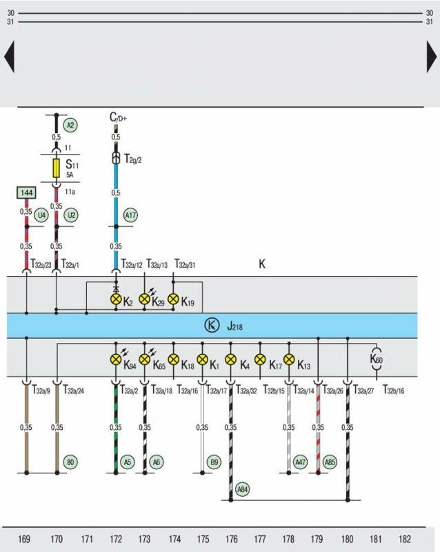 T32a – 32-контактный штекерный разъем, на панели приборов (синий);