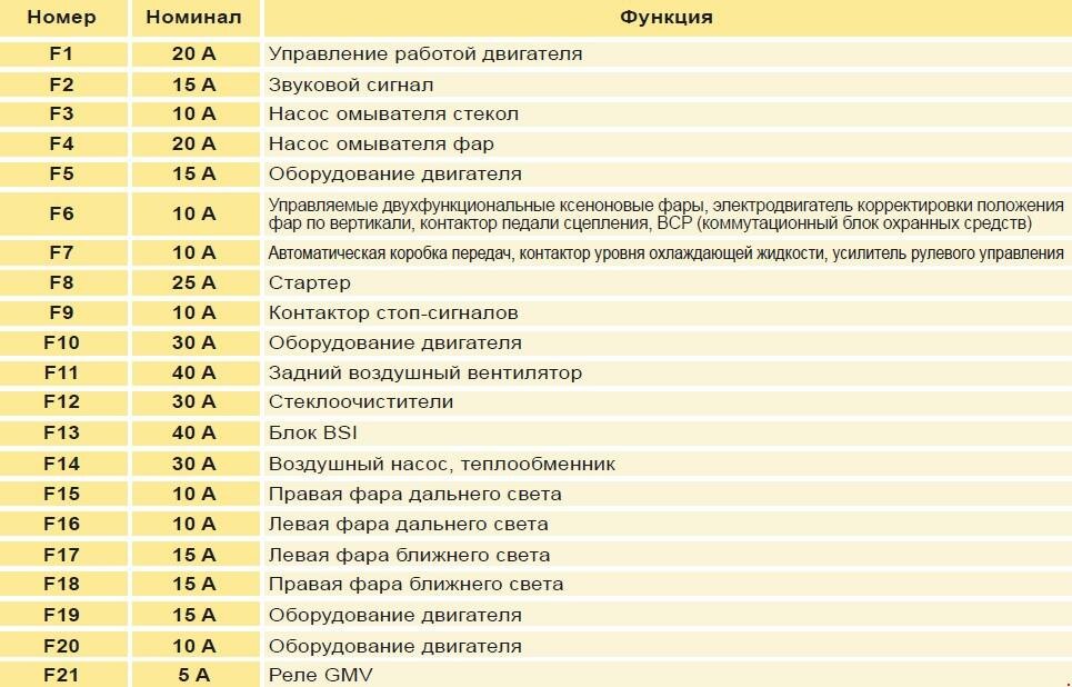Предохранители в моторном отсеке Ситроен С4