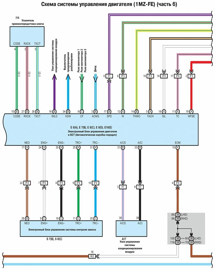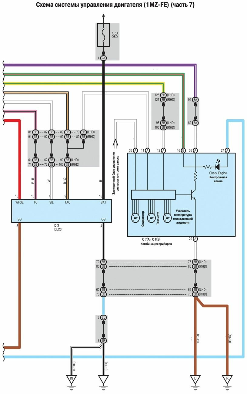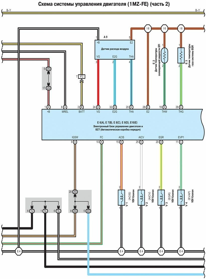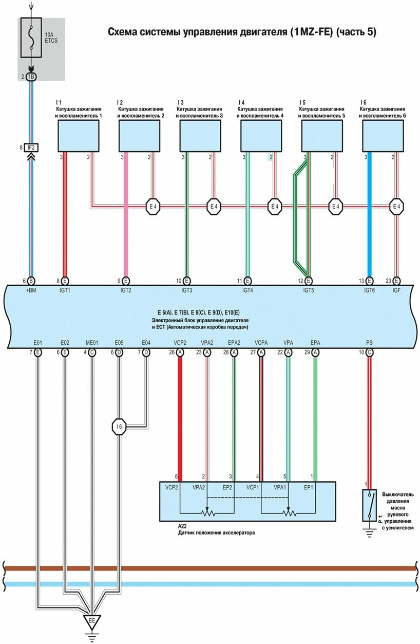 Сборник электросхем от двигателя 1MZ-FE автомобилей Тойота Камри 2001-2005 годов выпуска. Модель Camry обладает прочной внутренней структурой. Конструкция, прекрасно продуманная с точки зрения безопасности и передовых технологий, обеспечит ощущение надежности и всестороннюю заботу о водителе и пассажирах. Автомобиль обладает повышенной прочностью при столкновениях. Передняя и задняя зоны деформации, усиленные стойки и брусья, защищающие от боковых ударов, уменьшают деформацию кабины при столкновении, а также снижают угрозу травмирования людей, находящихся в автомобиле. Для защиты водителя дополнительно предусмотрены убирающийся педальный узел, что сводит к минимуму вероятность травмы ног, и травмобезопасная энергопоглощающая рулевая колонка, которая действует совместно с ремнями безопасности и подушками безопасности, уменьшая риск травмы при столкновениях.