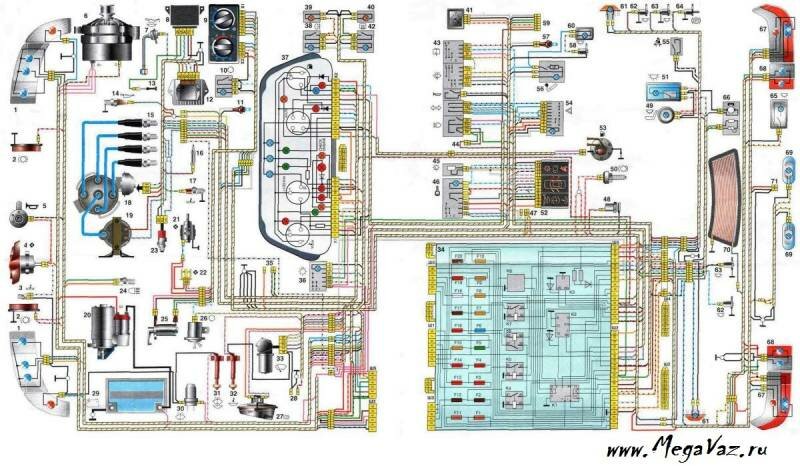 1. блок-фара; 2. датчики износа передних тормозных колодок; 3. датчик включения электродвигателя вентилятора; 4. электродвигатель вентилятора системы охлаждения двигателя; 5. звуковой сигнал; 6. генератор: 7. датчик уровня масла; 8. блок управления электромагнитным клапаном карбюратора; 9. контроллер отопителя; 10. выключатель клапана рециркуляции; 11. лампа подсветки рычагов управления отопителем; 12. коммутатор; 13. концевой выключатель карбюратора; 14. датчик контрольной лампы давления масла; 15. свечи зажигания; 16. электромагнитный клапан карбюратора; 17. датчик указателя температуры охлаждающей жидкости; 18. датчик-распределитель зажигания; 19. катушка зажигания; 20. стартер ВАЗ-2111; 21. электродвигатель вентилятора отопителя; 22. дополнительный резистор электродвигателя отопителя; 23. датчик скорости; 24. выключатель света заднего хода; 25. микромоторедуктор привода заслонки отопителя; 26. клапан рециркуляции; 27. датчик уровня тормозной жидкости; 28. колодки для подключения электродвигателя омывателя заднего стекла; 29. аккумуляторная батарея; 30. электродвигатель смывателя ветрового стекла; 31. датчик уровня омывающей жидкости; 32. датчик уровня охлаждающей жидкости; 33. моторедуктор очистителя ветрового стекла; 34. монтажный блок: 35. колодки для подключения жгута предупредительного света; 36. переключатель наружного освещения; 37. комбинация приборов; 38. выключатель заднего противотуманного света; 39. контрольная лампа противотуманного света; 40. контрольная лампа обогрева заднего стекла; 41. часы; 42. выключатель обогрева заднего стекла; 43. подрулевой переключатель; 44. колодка для переключения проводов при установке блок-фар другого типа; 45. регулятор освещения приборов; 46. выключатель зажигания; 47. колодки для подключения жгута проводов очистителей фар; 48. розетка для переносной лампы; 49. плафон индивидуального освещения салона; 50. выключатель стоп-сигнала; 51. плафон освещения салона; 52. блок бортовой системы контроля; 53. датчик указателя уровня топлива; 54. выключатель аварийной сигнализации ВАЗ-2111; 55. датчик ремня безопасности водителя; 56. прикуриватель; 57. лампа подсветки пепельницы; 58. выключатель лампы освещения вещевого ящика; 59. колодка для подключения бортового компьютера; 60. лампа освещения вещевого ящика; 61. боковые указатели поворота; 62. выключатели в стойках передних дверей; 63. выключатели в стойках задних дверей; 64. выключатель контрольной лампы стояночного тормоза; 65. фонарь освещения багажника; 66. датчик температуры для системы отопления; 67. наружные задние фонари; 68. внутренние задние фонари; 69. фонари освещения номерного знака; 70. элемент обогрева заднего стекла; 71. колодка для подключения дополнительного стоп-сигнала ВАЗ 2111.