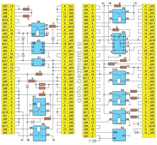 - К4 - реле контроля исправности ламп (внутри показаны контактные перемычки, которые устанавливаются вместо реле);